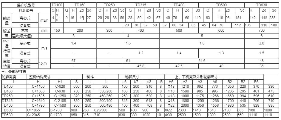 TD帶式斗式提 升機,按國家標準設計制造。選用高強力運輸帶,有離心式/混合式兩種方式卸料,提升高度達40米(物料r≤1.5),輸送量4-240m3/h)。 本機適用于垂直輸送粉狀、粒狀、小塊狀的無磨琢性或半磨琢性散狀物料,如糧食、煤、粉、焦末、水泥、碎礦石、硅酸鹽等。被輸送的物料溫度一般≤80℃;選用耐熱輸送帶時≤200℃。 二、技術參數